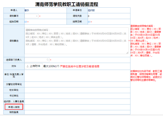 7.请假期满返校后,在“渭南师范学院教职工请销假流程”中及时填写“申请人销假”信息。