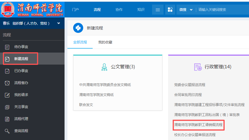 5.选择“新建流程”,点击行政管理栏中“渭南师范学院教职工请销假流程”。